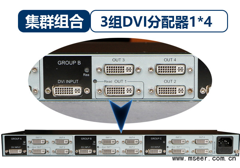 將3組DVI分配器組裝在一臺標(biāo)準(zhǔn)1U機(jī)架中。可將3路單鏈路DVI 信號分別分配到4路數(shù)字式顯示器。支持高達(dá)1920x1200P60的DVI-D信號。