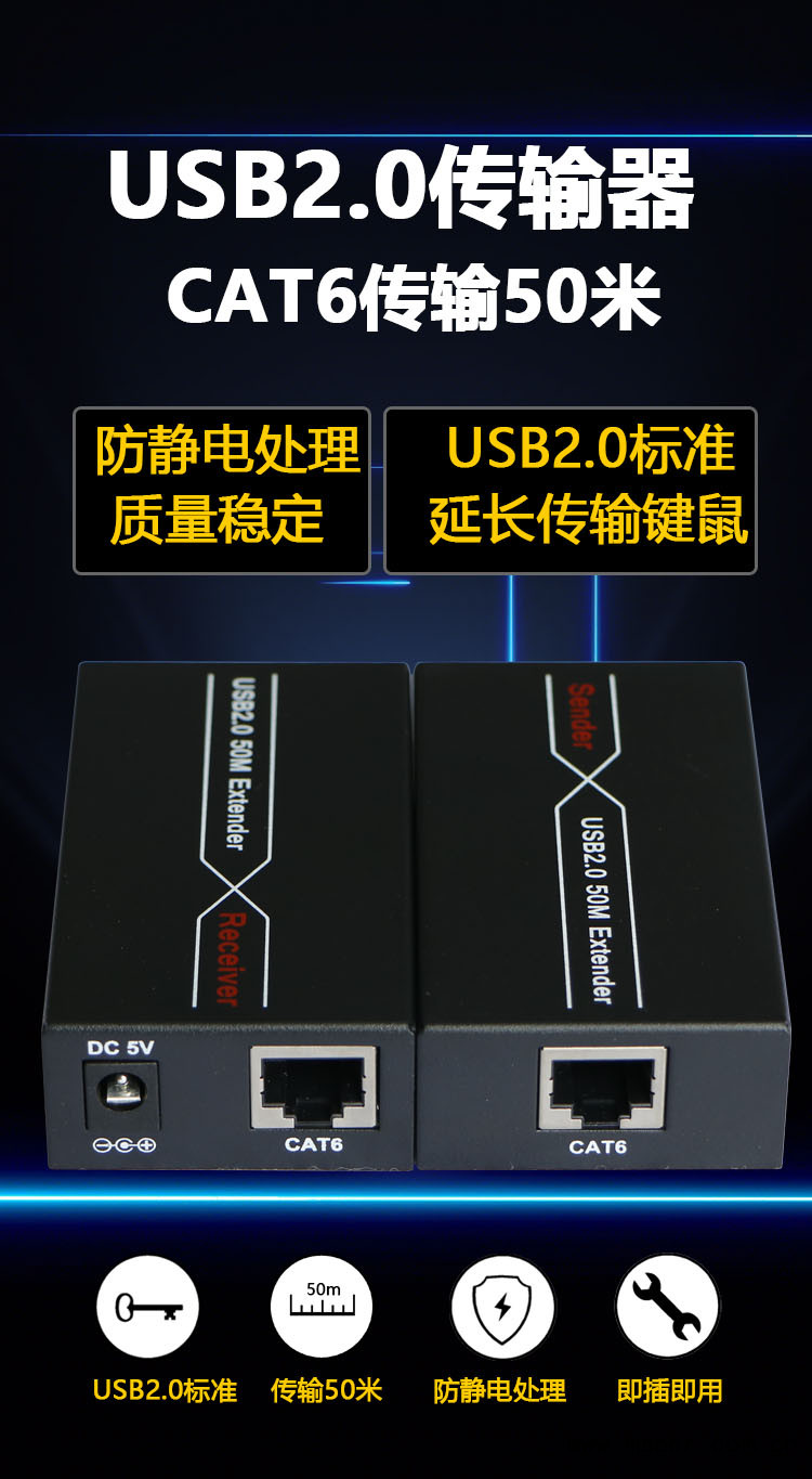 USB2.0延長器包括本地發(fā)送端(Transfer)與接收端(Receiver),可以通過單根CAT5/5e/6網(wǎng)線,將電腦的USB信號(hào)延長50米。傳輸速率高達(dá)480Mbps。該產(chǎn)品廣泛應(yīng)用于電腦長距離連接打印機(jī)、掃描儀、鍵盤、鼠標(biāo) 和U盤等設(shè)備。即插即用,無需驅(qū)動(dòng)和安裝設(shè)置。